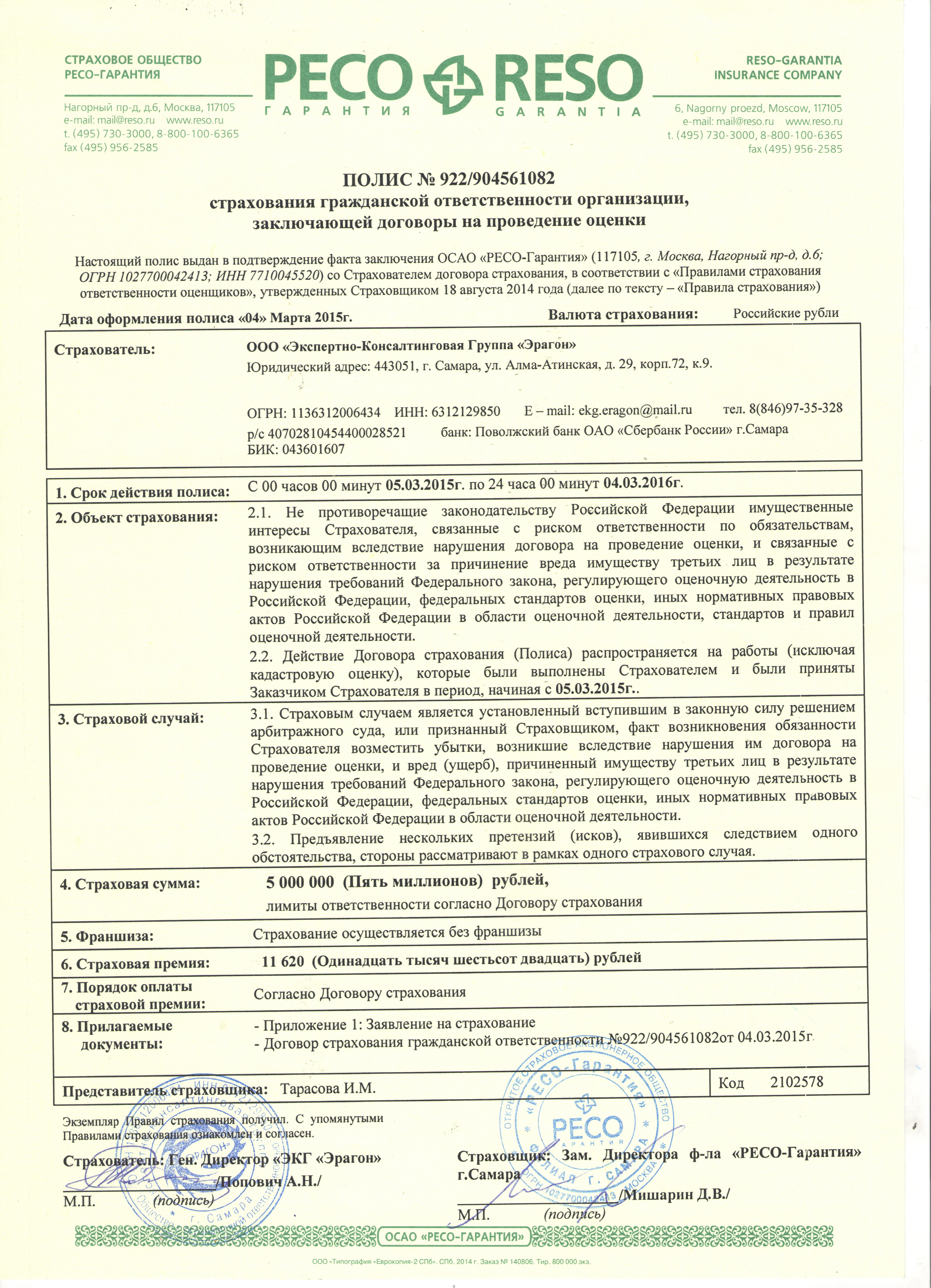Страхование ответственности Исполнителя (юридического лица)Дополнительная ответственность Исполнителя в размере страховой выплаты на сумму 5 000 000 (Пять миллионов) рублей по полису (договору) страхования ответственности оценщика ОСАО «РЕСО-Гарантия» №922/904561082 от 04.03.2015 г. (срок действия с 05.03.2015 г. по 04.03.2016 г.) наступает в случае вступившего в законную силу решения суда по факту причинения ущерба и обязанности ООО ЭКГ «ЭРАГОН» возместить данный ущерб. |